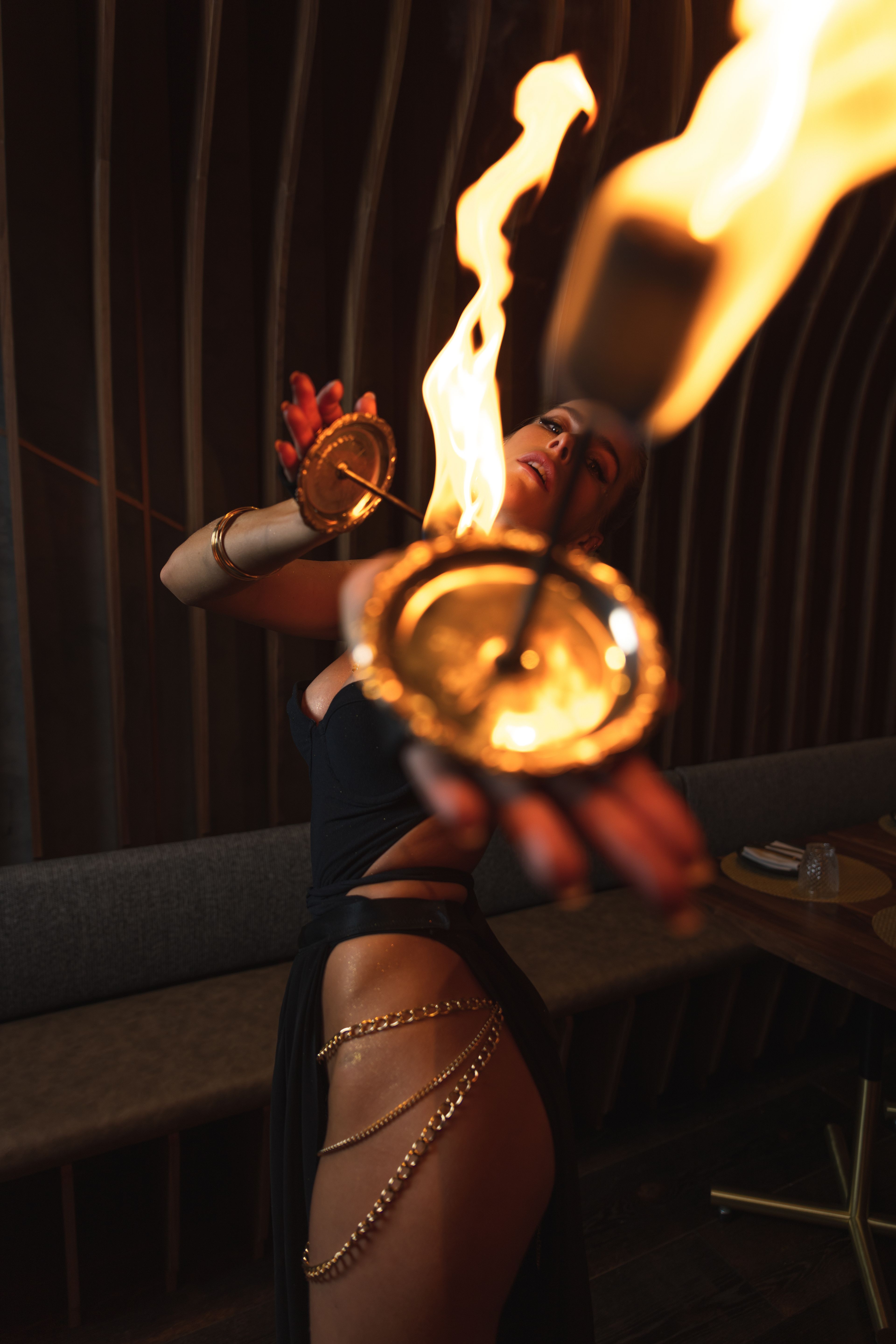 Two smaller private dining rooms are encased in glass on two sides and located between the main bar and the dining room — offering guests a secluded spot that is still in full view of the fire dancers that pass through the main restaurant. The larger private room has its own bar.